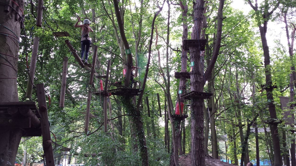 W parku jesteśmy cały czas pod okiem instruktora, małe zdziwienie wywołałem szybkością przechodzenia tras, normalnemu klientowi granatowa trasa zajmuje ponad godzinę, ja się wyrobiłem z wszystkimi w półtora godziny. Co do przeszkód to trafiłem tutaj na : Deskorolka, Przeciąganie beczki, Skok na siatkę, Rower, Toczenie walca, ale najlepszą przeszkodą był “Most długi”, jest to lina rozciągnięta przez cały plac z dwoma linami które możemy trzymać, lecz na środku placu całość bardzo się buja i ciężko jest utrzymać równowagę. Dodatkowo można było wygrać dodatkowe przejście, na granatowej trasie dostałem dwa woreczki i przy zjeździe tyrolką miałem rzucać do tarczy która jest umieszczona na środku placu. Niestety, nie udało mi się zdobyć dodatkowego biletu, ale było blisko.
