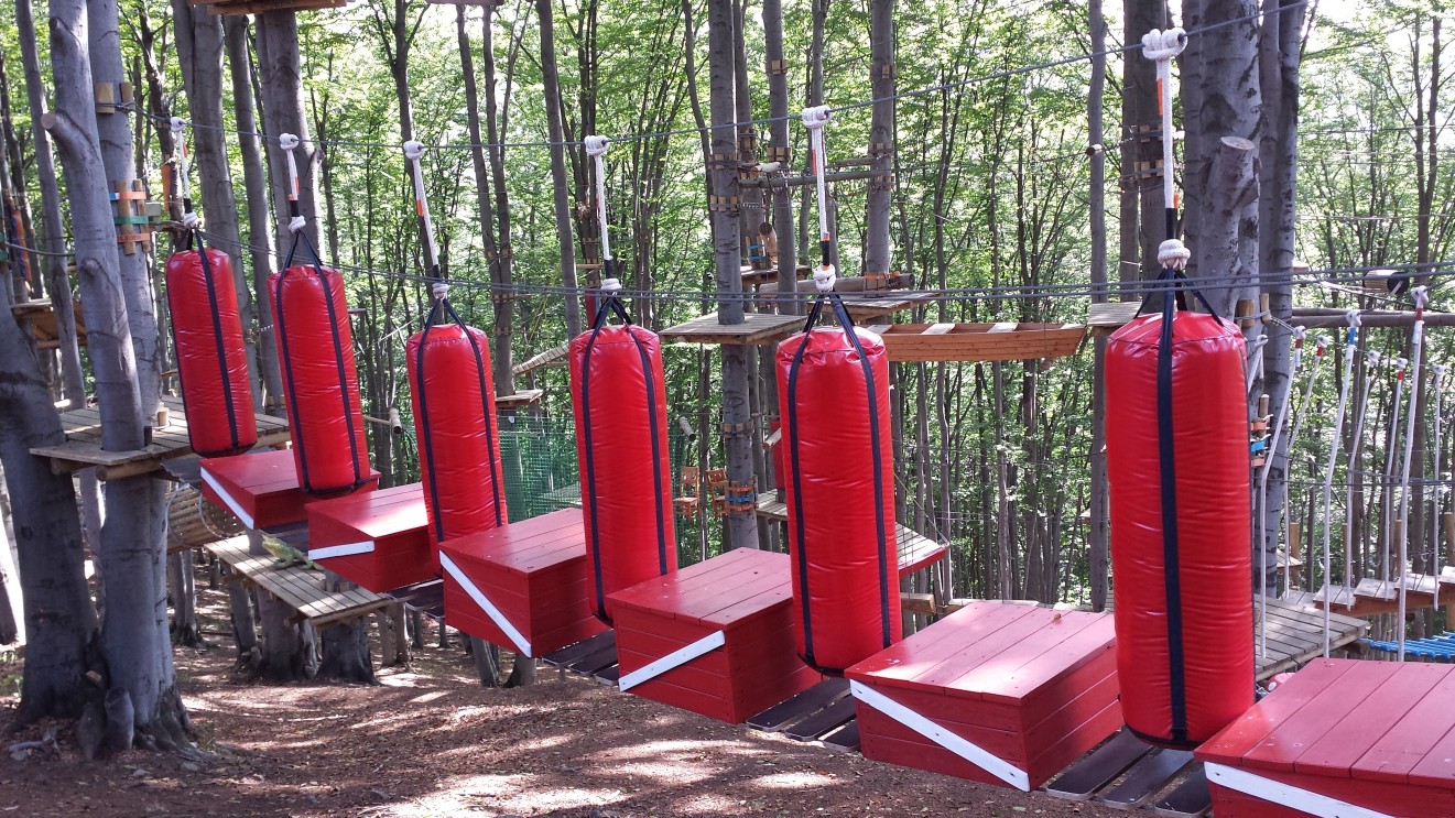 Przejdźmy do opisu przeszkód. W tym parku zobaczyłem bardzo dużo unikalnych przeszkód, których do tej pory nie widziałem. Sprawia to, że ten park jest dla mnie numerem jeden. Mamy tutaj następujące przeszkody: drzwi wahadłowe, gokart, deskorolka, wóz drabiniasty, dębowe beczki, stół biesiadny, walec, 4 metrowa łódź rybacka oraz monocykl. Dodatkowymi atrakcjami są Base Jump, czyli skok w pionie w dół, za pomocą którego zmienia się poziom z górnego na dolny, TreeClimbing, czyli nadrzewna ścianka wspinaczkowa, którą uczestnicy wydostają się na wysokość 12 m oraz najdłuższa, 63 metrowa tyrolka.