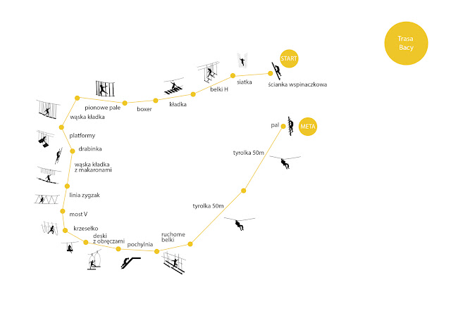 Możemy wybrać trasę babiogórską która jest tak naprawdę trasą leśną tylko pierwsze dziesięć przeszkód pokonujemy za pomocą 200 metrowej tyrolki.