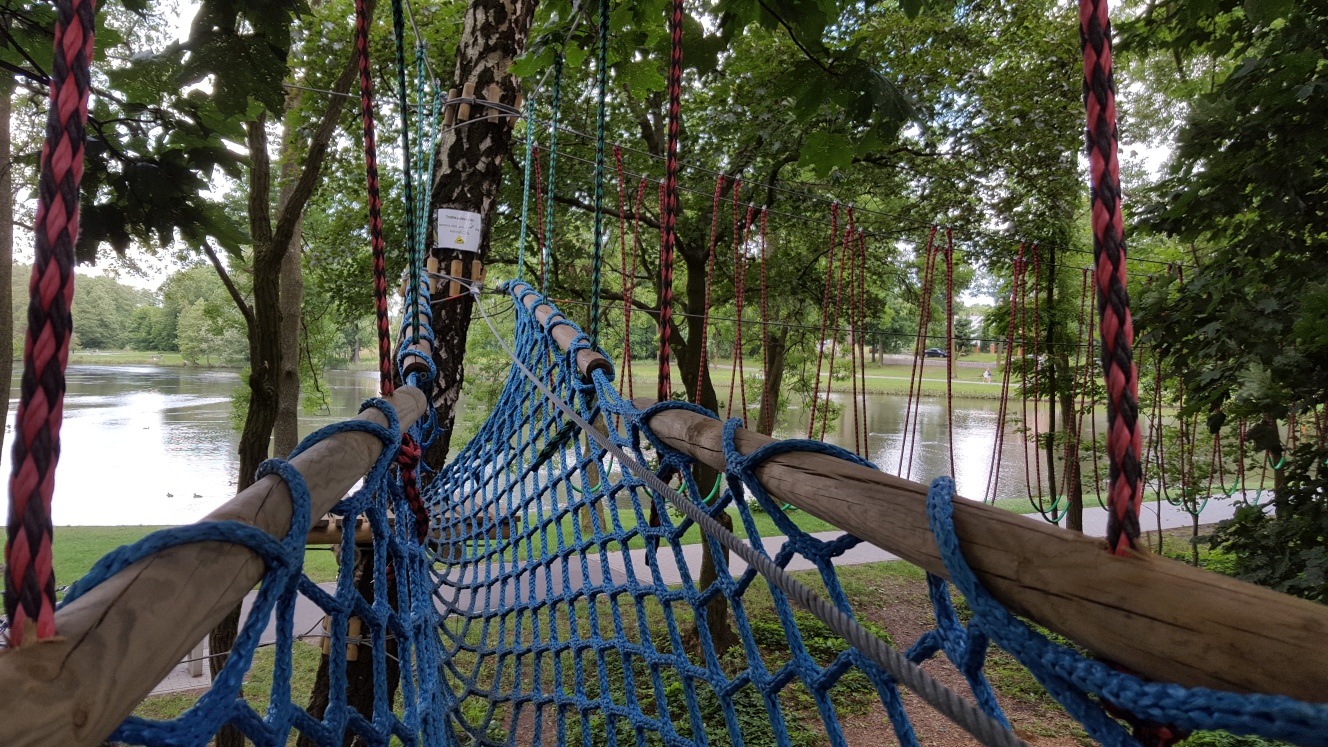Mamy tutaj dwie trasy: niską i średnią. Obie trasy przechodzimy w uprzęży. Niższa jest zawieszona na wysokości metra, gdzie rodzic może pomagać swojemu dziecku poruszać się na niej. Jeżeli trasa niska jest za łatwa, to można skorzystać z trasy średniej, która jest umieszczona na wysokości od 3 do 4 metrów.