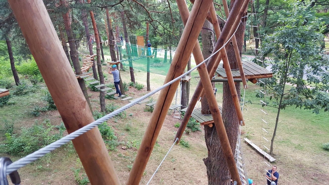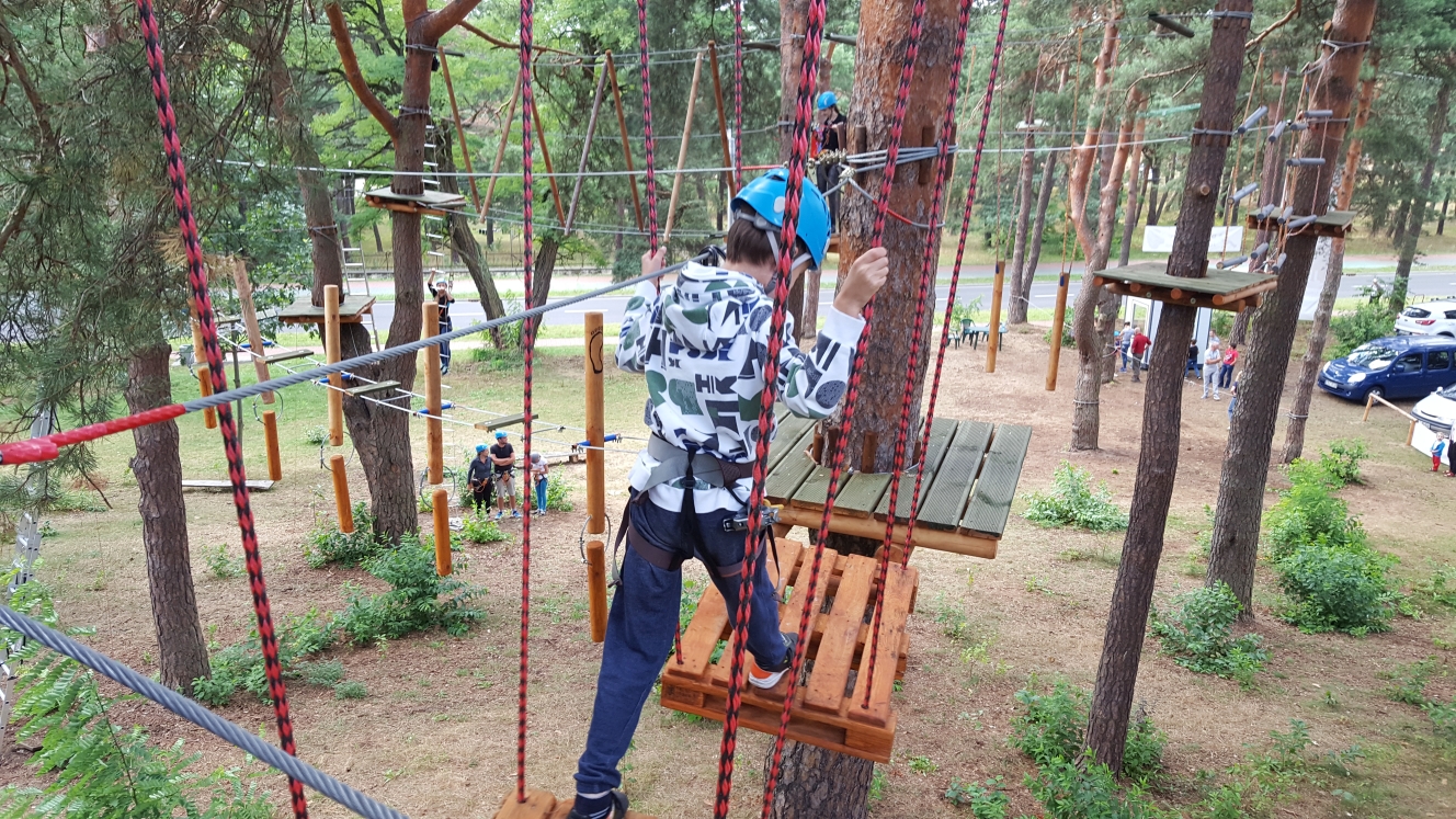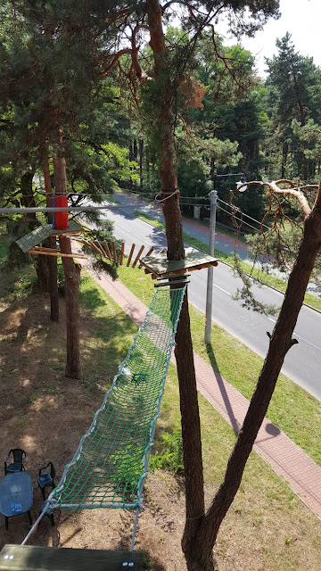 Mamy tu sporo ciekawych przeszkód, które mogą nam sprawić troszkę problemów. Na początek spróbujcie przejść "Kładkę DNA" w górę. A może chcecie "Skok tarzana", to zapraszam na trasę czarną. Na niebieskiej musicie się zmagać ze "Ścianką wiszącą" która nie jest prosta, wymaga od nas mocnych rąk. Ok, to moje ulubione przeszkody. Dla was mamy fantastyczne tyrolki, zgadłem. Wiem co lubicie. A może coś łatwiejszego "Iksy" to każdy przejdzie. Możecie obejrzeć filmik, jak na nich się zamotałem.