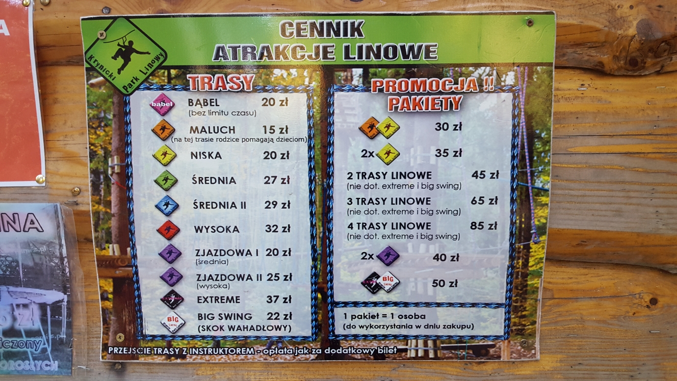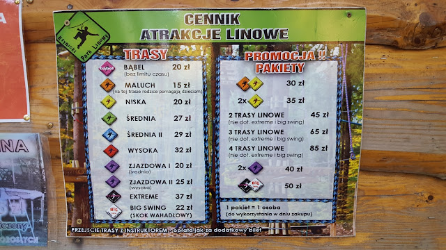 Wróć, zapomniałem o cenniku. Ja dostałem możliwość przetestowania całego parku, aby go wam pokazać, za co bardzo dziękuję. Jak wygląda cennik przy 9 trasach? Ceny są umiarkowane, mamy sporo promocyjnych pakietów. A co najlepsze, dowiedziałem się, że park funkcjonuje cały rok. Doczepić mógł bym się tylko do trasy extreme, która kosztuje 37 zł. Po moich podróżach dookoła Polski, taka trasa nie powinna przekraczać 30 zł. Z drugiej strony, trasa jest warta wydania tych pieniędzy, ponieważ jest bardzo wymagająca i tylko osoby wprawione w bój powinny z niej skorzystać. Ale o tym opowiem później.