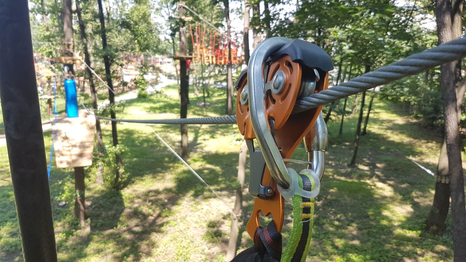 Parku zabezpieczeniem jest asekuracja ciągła - jak się raz wepniemy do trasy, to dopiero przy zejściu możesz się wypiąć. Nie ma możliwości wypięcia w czasie przechodzenia naszej drogi. Zaskoczyło mnie rozwiązanie z bloczkiem do zjazdów. Ten był na magnesie i nie było trzeba zaczepiać go o sznureczek, tylko przyczepia się go do boku (bardzo ciekawe rozwiązanie).
