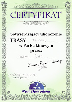 Za pokonanie trasy trudnej otrzymałem certyfikat, który trafi do mojej kolekcji jak pocztówki z kolejnych miasta. Świetnie się tutaj bawiłem i zapraszam was do odwiedzenia tego parku. Ja ruszam w dalszą drogę, aby odkrywać kolejne fajne miejsca.